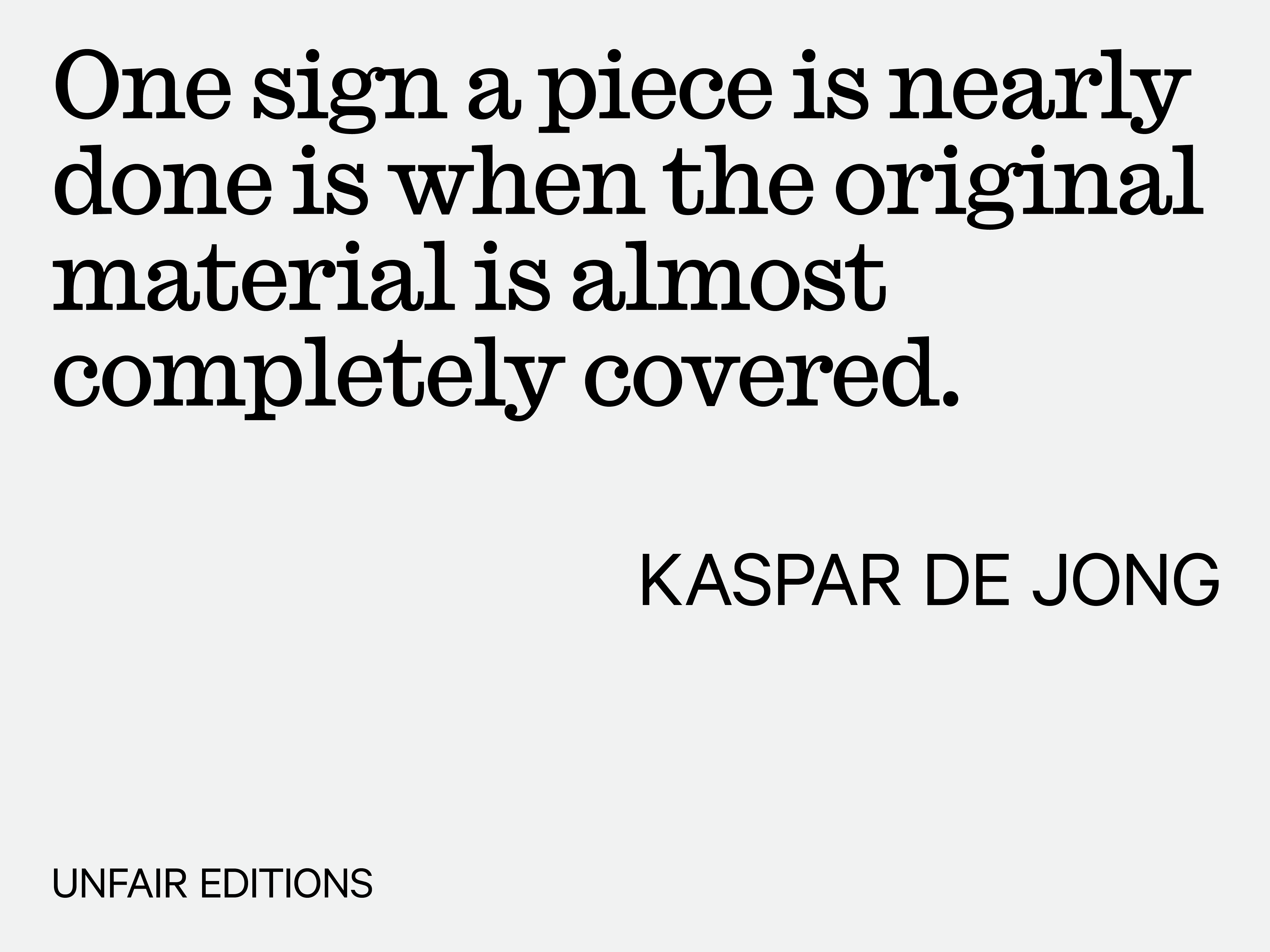 The edition takes inspiration from the concept of the palimpsest, ancient parchments that were scraped, reused and overwritten once their original message had faded in meaning. The aim was in this edition to gain a similar visual character trough the shifting and layered traces in the unstreched canvas.