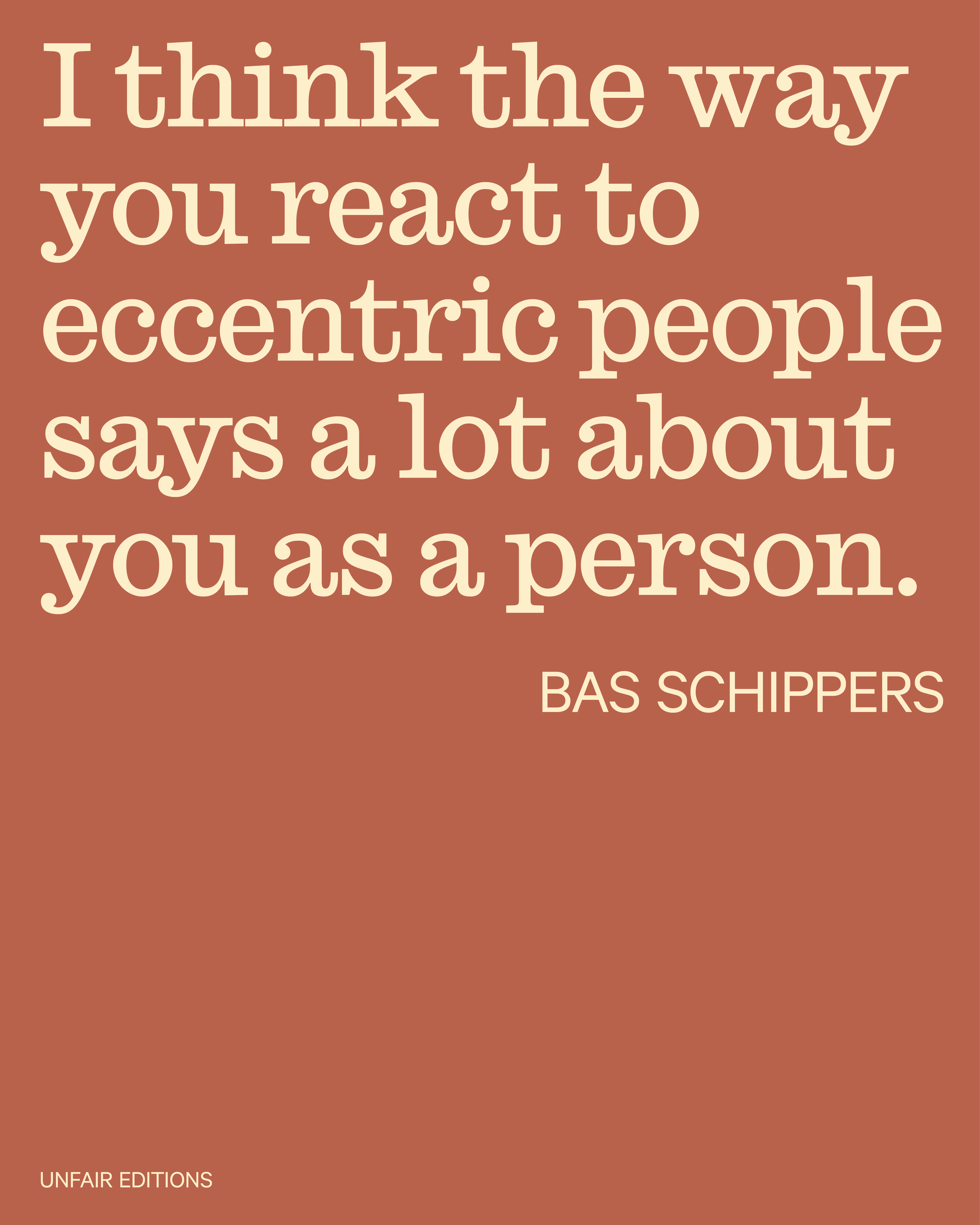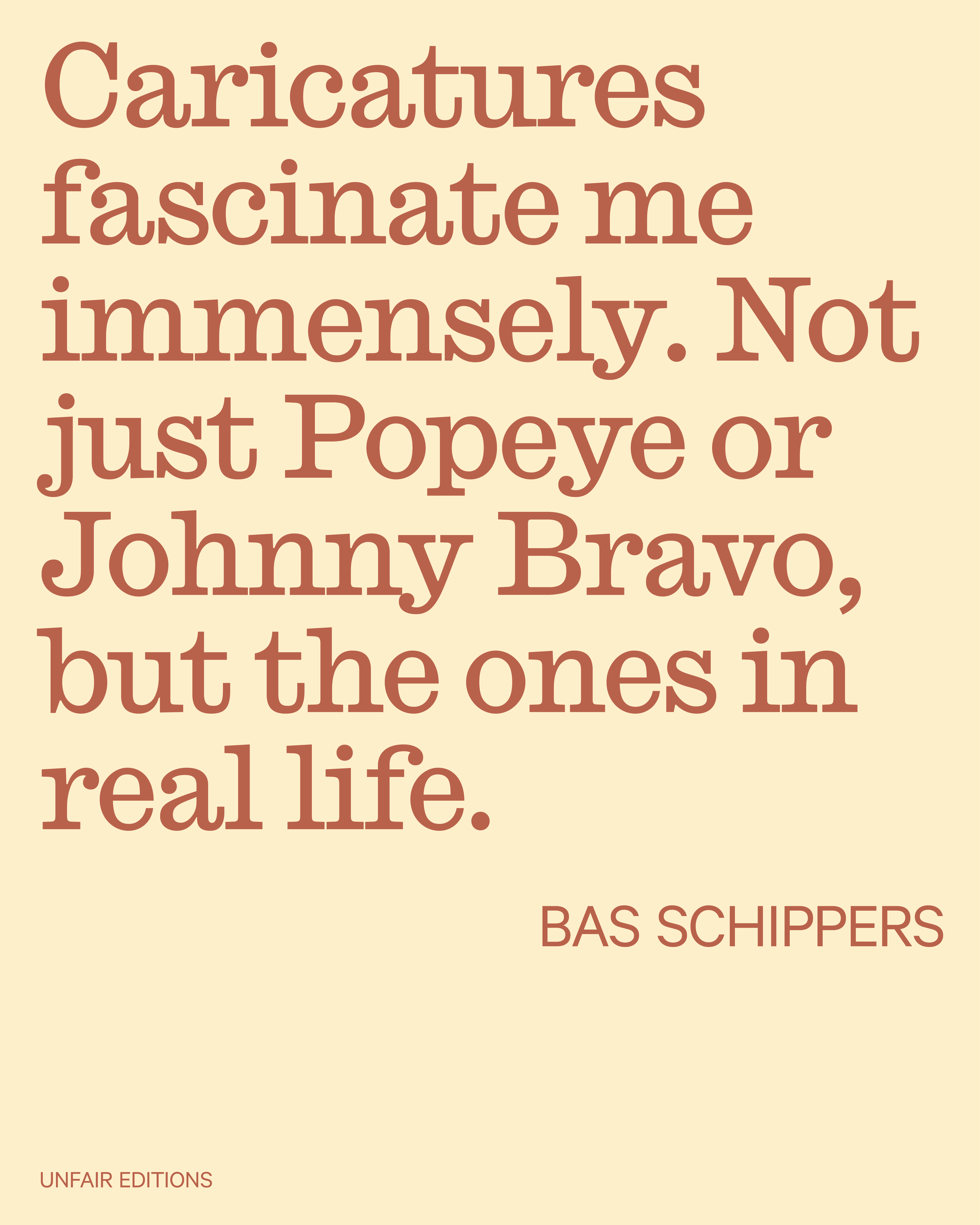 Caricatures fascinate me immensely. Not just the ones in comics or animations like Popeye or Johnny Bravo, but especially ones in real life. Personas and characters, the ones you remember and recognize because of a specific character trait, hobby, accessory, haircut or catchphrase. I even adopt little things here and there that I find cool or quirky—a toothpick, a bandana. I’m also interested in how these people are perceived. In a way, they are outcasts. Ridiculed by some, admired by others. I think the way you react to eccentric people says a lot about you as a person. Maybe that’s also why I like to look eccentric myself, it’s the perfect radar for detecting and filtering out people who are not genuine or unkind.