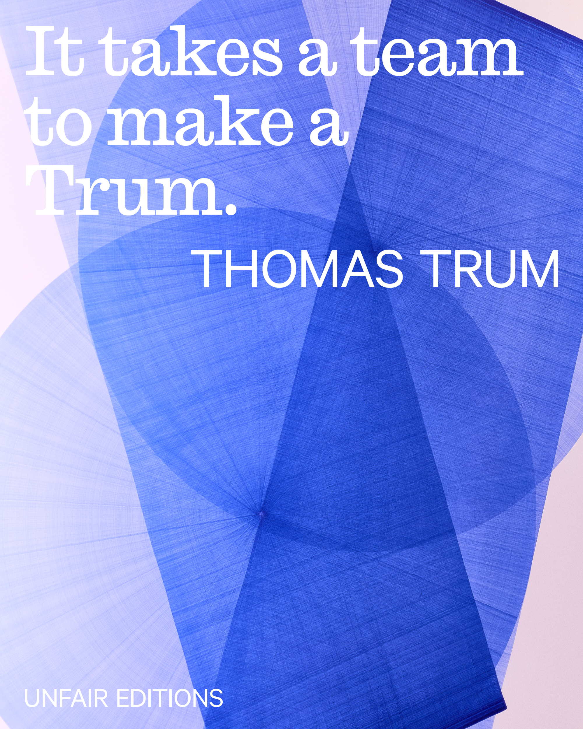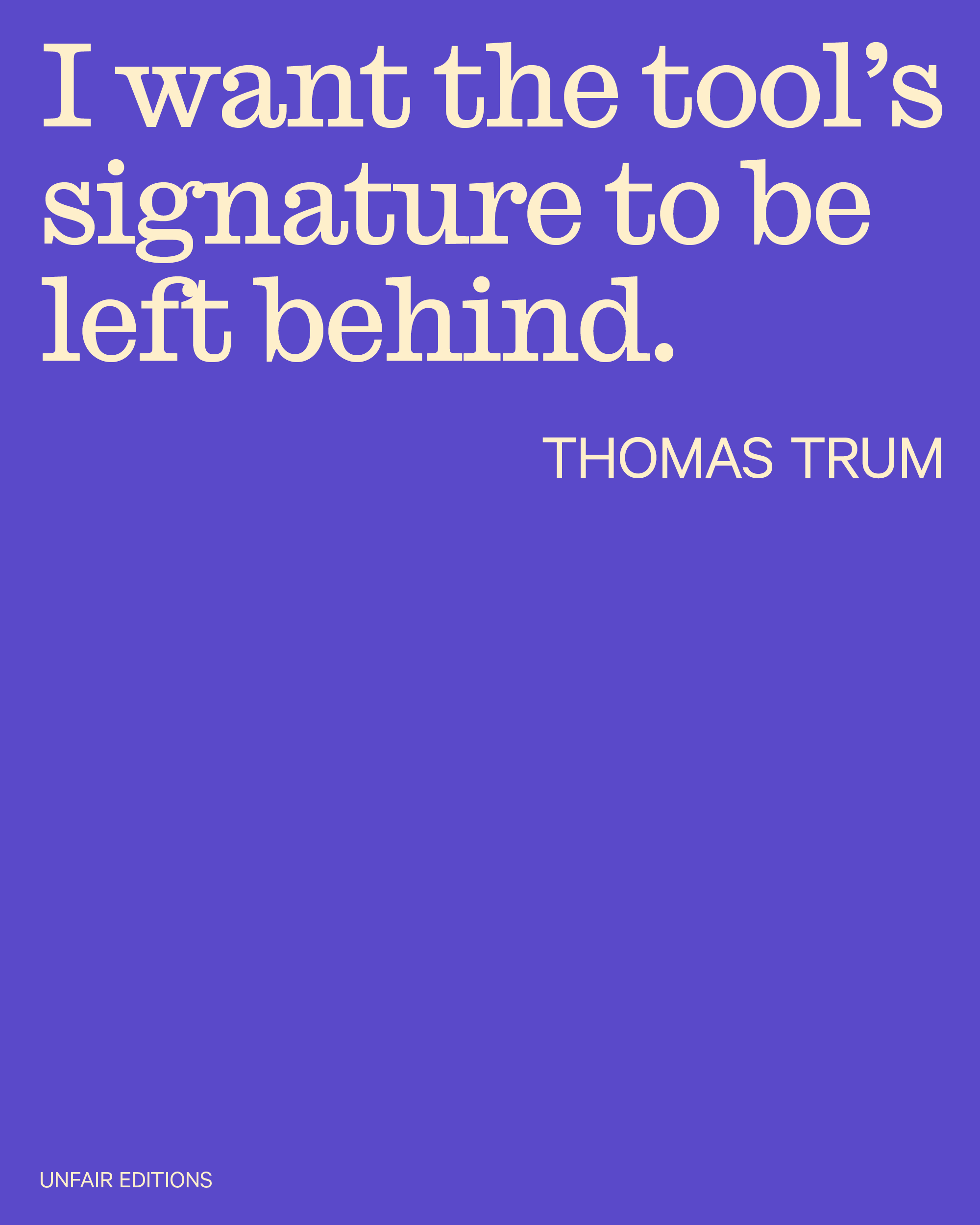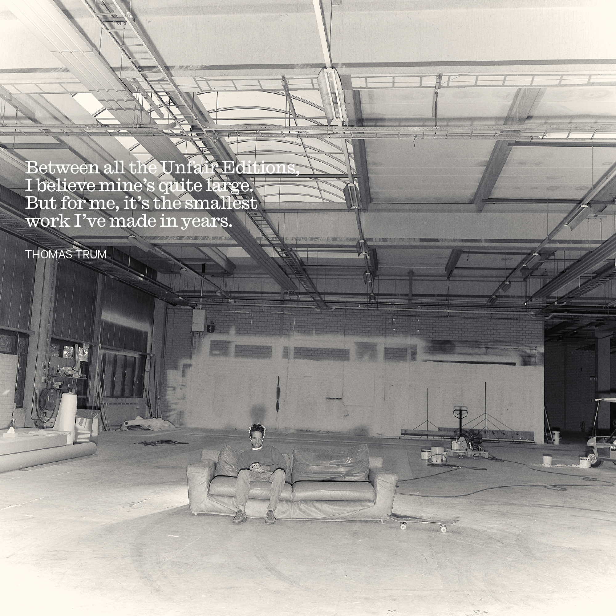 TT: I mostly work in large spaces, sometimes even with up to five people making one line at the same time. Between all the Unfair Editions, I believe mine’s quite large. But for me, it’s the smallest work I’ve made in years. But if you put it in a house, it’s actually quite large again. It’s not a digital, reproduced print. I just repeated the same physical process for 75 times. And I’d say... that makes it much more interesting for me. The great equalizer between everything is the balance between optimization, reproducibility, and human action. If you look at my work without any reference to scale, and you put small next to large, you can’t really tell the difference. And I think that’s super cool. It draws you in.