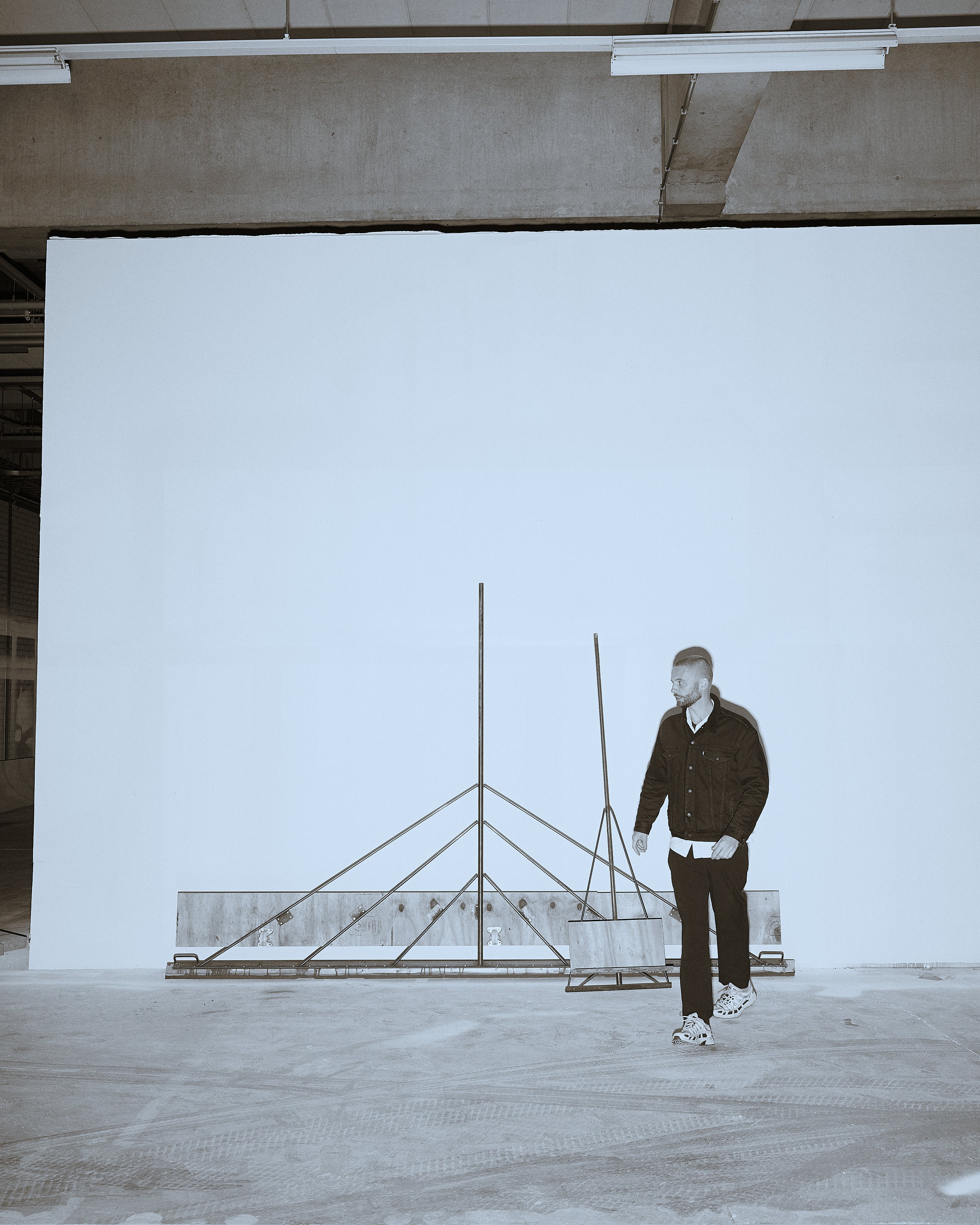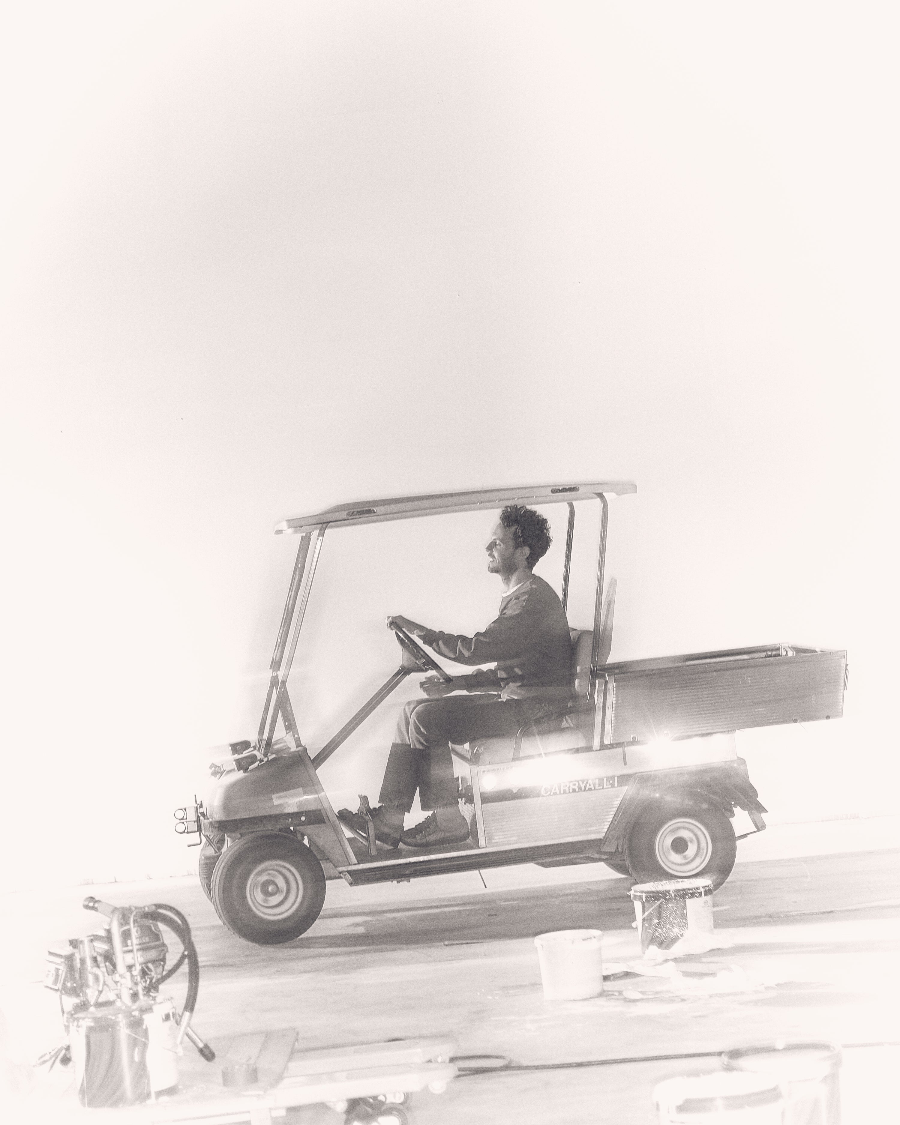 We walk around the complex to visit studio 2, a massive 5000m2 industrial hall. Different tools and workstations are spread round the space, like a golf cart, scissor lift, paint spraying machines and giant handmade “markers” that Trum uses to make his largest works.