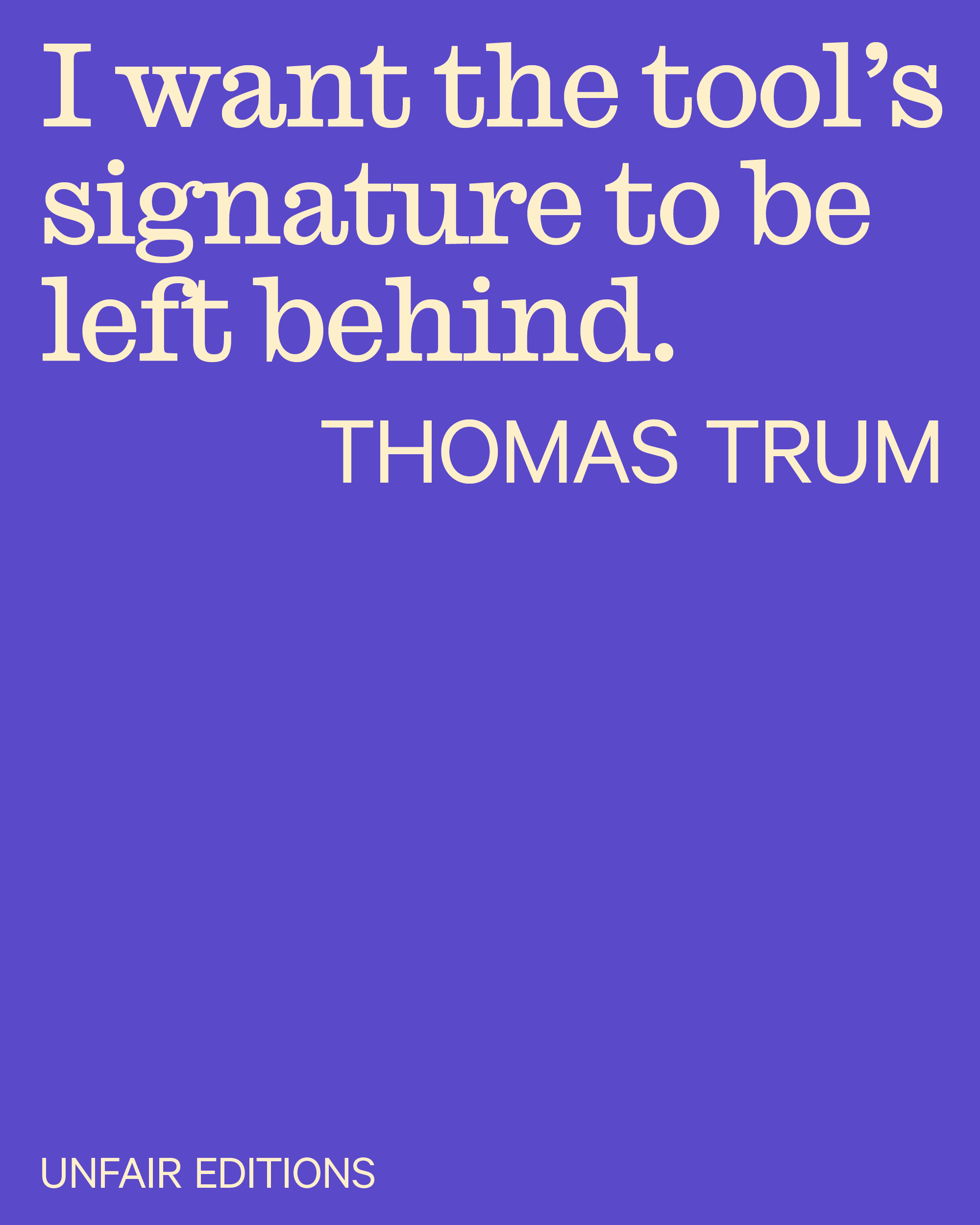 TT: I mostly work in large spaces, sometimes even with up to five people making one line at the same time. Between all the Unfair Editions, I believe mine’s quite large. But for me, it’s the smallest work I’ve made in years. But if you put it in a house, it’s actually quite large again. It’s not a digital, reproduced print. I just repeated the same physical process for 75 times. And I’d say... that makes it much more interesting for me. The great equalizer between everything is the balance between optimization, reproducibility, and human action. If you look at my work without any reference to scale, and you put small next to large, you can’t really tell the difference. And I think that’s super cool. It draws you in.